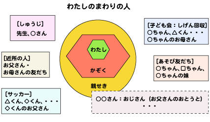 まず、「わたし」の一番近くにいる人は、かぞくですね。つぎに、いとこやおじさんなどしんせきの人がいます。名前とどんなかんけいなのかを書きましょう(図をまねしてつくってみてください)。