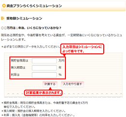 計算機を使う感覚で、データを入力すると、簡単に「目標額積立」や「必要貯蓄額」などの資金プランの計算をすることができます。
