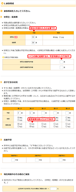 世帯人員(生計を共にするご家族の数)は、生活費の推計に影響しますので、世帯主・配偶者・お子さま以外の同居中のご家族がいらっしゃる場合は、その人数を入力します。