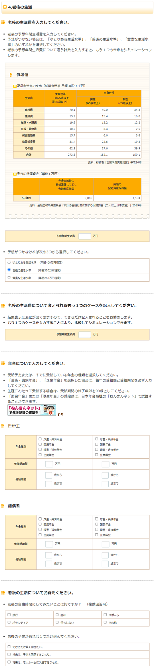 入力画面(老後の生活)の拡大画像です。この画像から操作はできません。