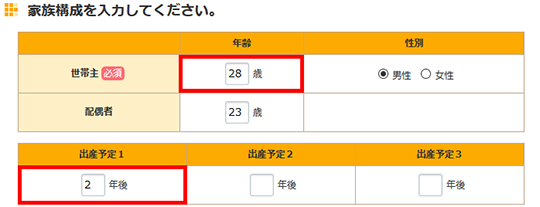 - 家族構成については、世帯主年齢を設定し、出産予定欄に予定年を設定します。