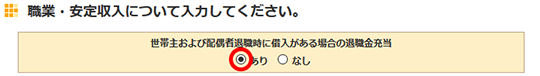 - 定年時に借入金がある場合には、退職金を充当しますので、「職業・安定収入」欄で退職金充当「あり」を選択します。