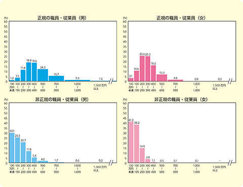 たとえば、正規の職員・従業員と非正規の職員・従業員では、以下のような年収の違いがみられます。