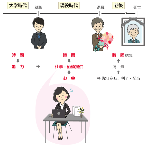人生をお金の観点からみると、老後は働いてお金を得ることが困難になるため、若いうちに働いてお金を貯めることになります(その貯蓄の取り崩しや利子・配当を、老後の支出にあてます)。これは、若いころの「時間」の一部を、「仕事」(価値の提供)を通じて「お金」に換え、その「お金」を老後の「時間」の充実(消費など)にあてていると見ることもできます。