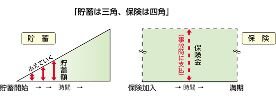 貯蓄は少しずつしか増えませんので、最初はカバーできる損失の額が限定されます。これに対し、保険は最初から損失を賄う額を確保できます。このため、「貯蓄は三角、保険は四角」といわれます(下にイメージ図)。