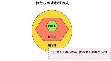 まず、「わたし」の一番近くにいる人は、かぞくですね。つぎに、いとこやおじさんなどしんせきの人がいます。名前とどんなかんけいなのかを書きましょう(図をまねしてつくってみてください)。