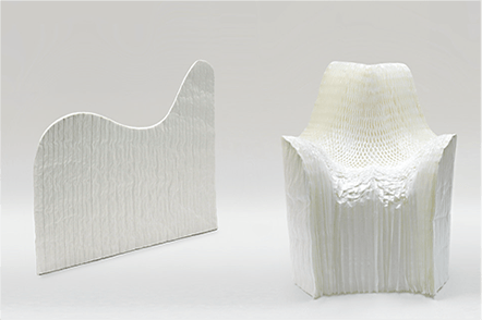 「何より、自然界に存在する構造であることに魅力を感じたのです。まずは、小さなサンプルから検証を始めました。普通、紙はつぶれることで価値を失いますが、僕はそのグシャッとなった姿が、逆にきれいだなと思ったんです。そうやって、既成概念を取り払い、誕生したのが、ハニカム構造を持つ椅子『Honey-pop』です」。