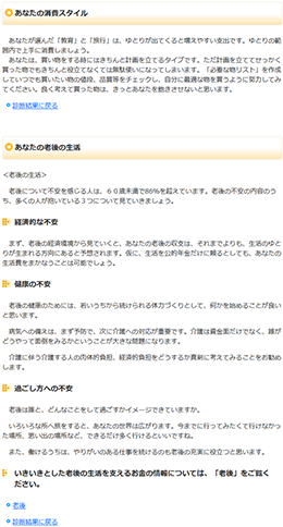 あなたの老後の生活では、老後について多くの人が抱いている経済的な不安、健康の不安、過ごし方への不安の3つについて、メッセージ・アドバイスを表示します。
