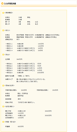 入力内容詳細では、シミュレーション時にどのような入力をしたか、その内容をあらためて表示します。
