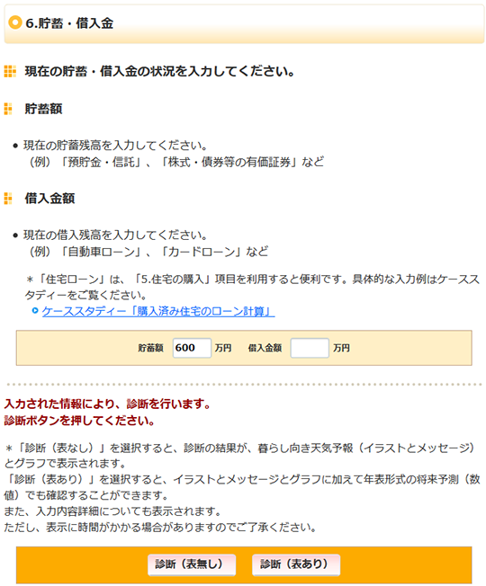 入力画面(貯蓄・借入金、診断ボタン)の拡大画像です。この画像から操作はできません。