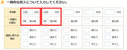 - 保険受け取りのうち、一回限りの場合は、「一時収入」で入力できます。