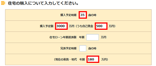 - 購入予定時期、購入予定額および自己資金を入力します。