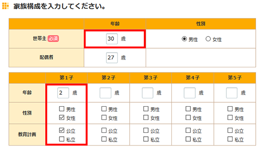 - 家族構成では、世帯主年齢を設定し、子どもの状況では、お子様の年齢、性別、教育計画の公立を設定します。