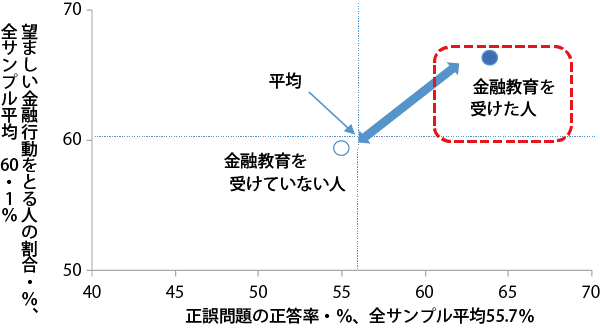 次に、金融教育を受けた人ほど望ましい金融行動をとる人の割合が高いという結果が出ています。紙の上での正答率が高くなるだけでなく、たとえば、金融商品を購入する際に他の金融機関や商品と比較するなど、実際に望ましい金融行動をとることに結びついているということが言えます。
