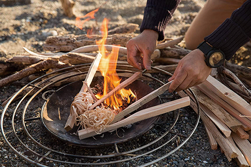 それを火種に移し、小枝から少し太い薪へと育てていけば焚き火の完成。