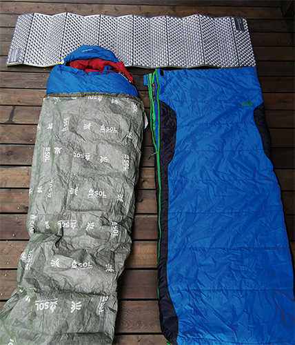 マミー型(左)と封筒型(右)の寝袋、上はマットの一例