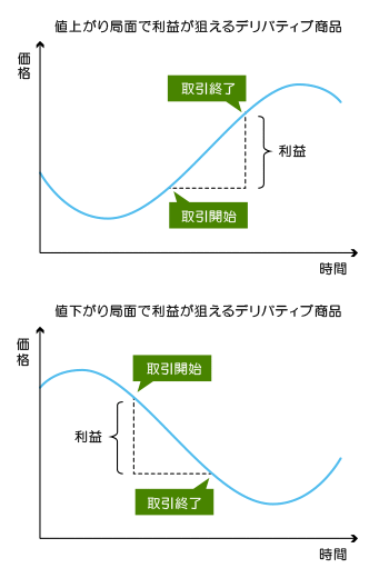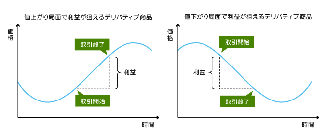 デリバティブ商品は、右肩上がりに限らず、右肩下がりの局面、すなわち価格の値下がりによって利益が得られるものや、あるいは価格が上がりも下がりもしないときに利益を得られるものもあります。