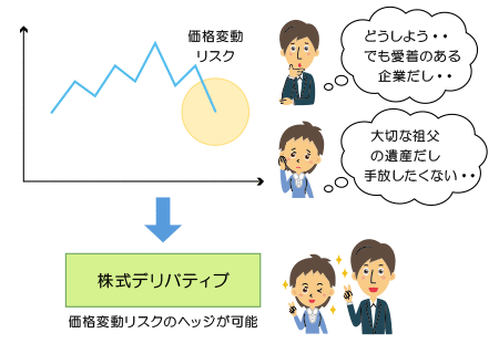 では、この価格変動リスクに対して、なすすべはないのかというと、そうではありません。株式デリバティブを同時に行うことで、保有株式の価格変動リスクをヘッジできます。