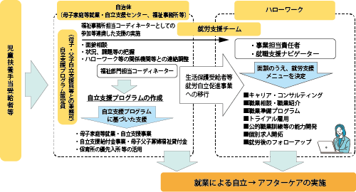 2005年度から実施されている、児童扶養手当受給者などを対象とした就労支援事業です。支援は、次のような流れになります。
