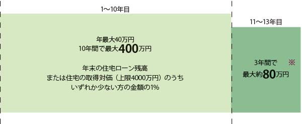 - 年末の住宅ローン残高または住宅の取得対価(上限4,000万円)のうちいずれか少ない方の金額の1%
