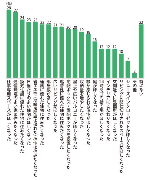 また、住宅に求める条件にも変化が見られます。「仕事専用スペースが欲しくなった」、「広いリビングが欲しくなった」など、広さへのニーズに加え、通風、遮音、日当たり、冷暖房効率などへのニーズも増しており、住宅に快適性を求める傾向が強まっています【図表7】脚注7。