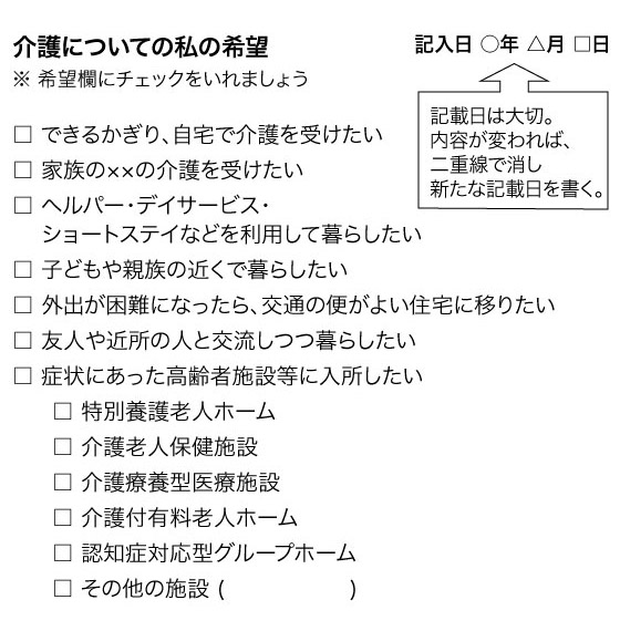 介護が必要になったら、どこでどんな介護を受けたいのか家族に残しておきましょう。