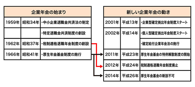 それまでの企業年金のうち、運営基準が緩やかな税制適格退職年金の廃止が決まり、厚生年金基金は健全な運営のために継続基準を厳格にし、財政状況が悪い基金には解散を命じることが可能としました。一方、新しい企業年金制度として、確定拠出年金法と確定給付企業年金法が制定され、2001年、2002年(平成13年、14年)に順次施行されました。