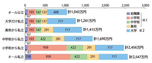 これを見ると、幼稚園から大学まですべて公立に通った場合は、1,043万円ですが、すべて私立の場合は、2,547万円とすべて公立の場合の約2.4倍となることが分かります。