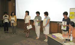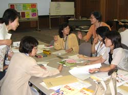 最後は先生方が9グループに分かれワークショップに入った。『きみはリッチ?』の本を教材化する時の要点項目の研究チェックや感想を分担して発表するグループ、『これであなたもひとり立ち』を教材にした「悪質業者の勧誘計画」グループでは悪質業者になってセールストークを考えたロールプレーシナリオを作成、「言っておきたいこと」 ―ひとり立ちの子どもへ― のグループでは、親の立場で子どもに金銭感覚育成として言っておかなければならない言葉を、子どもの性格も考え、ロールプレーシナリオの作成に取り組んだ。