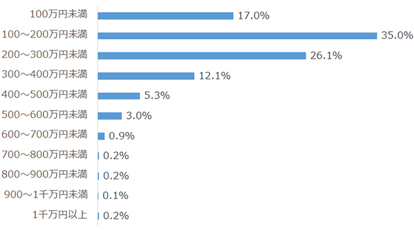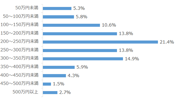 - ご祝儀制の披露宴やウエディングパーティをした人が受け取ったご祝儀総額の金額別分布。平均は227.8万円
