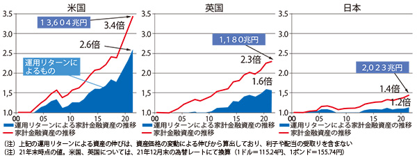 比較的投資が積極的に行われている米国では20年間で家計金融資産が3.4倍、英国では2.3倍になった一方、日本では1.4倍に留まっています【図表2】脚注2。