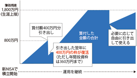 つまり、マイホームや車の購入、子どもの教育費など、資金が必要になったタイミングで運用している資産の一部を引き出して、その後は復活した投資枠を使って年間投資枠の範囲内で投資をすることができるようになるのです。