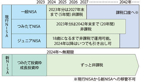 | 現行制度との関係 | 2023年末までに現行の一般NISAおよびつみたてNISA制度において投資した商品は、新しい制度の外枠で、現行制度における非課税措置を適用 | ||