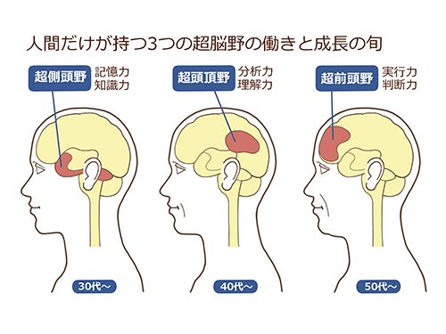 記憶力・知識力に関係する「超側頭野」は30代、多様な情報を統合して理解・分析する「超頭頂野」は40代、そして思考・判断し実行するための「超前頭野」は50代以降でようやく成長の旬を迎えます。