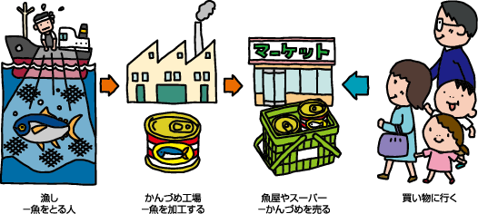 これは、野菜や肉など他の食べ物や飲み物でも、洋服やえんぴつ、ノートなどでも同じです。材料をそろえる人、加工する人、はん売する人たちがいることで、さまざまな物がみなさんの元にとどくのです。