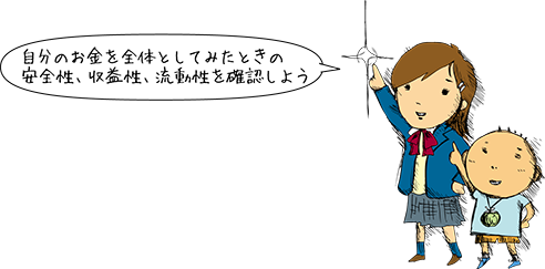 資産全体の「安全性、収益性、流動性」は、どの資産にどれだけのお金を割り振るか(資金配分)に依存します。資産全体の「安全性、収益性、流動性」がどうなっているかを確認し、お金(資産)の目的に照らして適切かどうか、考えるようにしましょう。