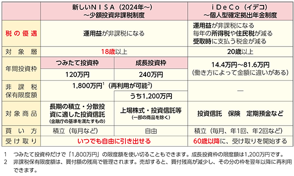 - 「お金の運用」の観点から、新しいNISAとiDeCoを見てみましょう。これらは国民の資産形成や老後資金の確保に役立つものとして、国の政策として普及が図られており、税金が優遇されています。これは「コスト」が軽減されることを意味しますので、お金の運用上、有利です。