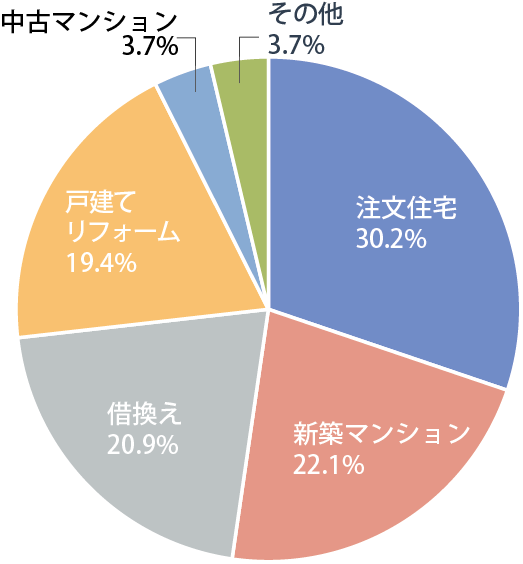 使途の内訳は、注文住宅が30.2%、新築マンションが22.1%、それに住宅ローンの借換え20.9%、戸建てリフォーム19.4%と続いています【図表5】。