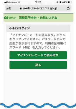 - マイナポータルアプリが起動し、マイナンバーカード方式による手続きを行います。e‒Taxにログインするためにマイナンバーカードを読み取り、初回登録などを行います。