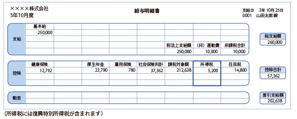 会社員が受け取る給与には、年間の課税所得に応じて所得税がかかります。しかし、1年が終わらないと課税所得は確定せず、正しい税額を算出できません。そこで、毎月の給与から概算で所得税が源泉徴収されます。この徴収額は、所得税法に規定する「給与所得の源泉徴収税額表(月額表)」に基づき、「その月の社会保険料等控除後の給与等の金額」によって、決まっています。その月にいくら徴収されたのかは、図表1‒①脚注1のように給与明細に記載されています。