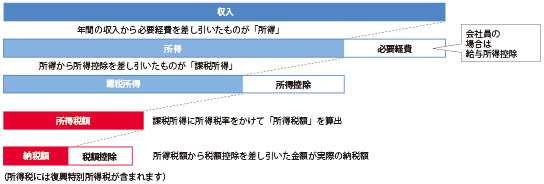 所得税は、給与の総額にかかるわけではありません。給与から会社員の必要経費に当たる「給与所得控除」および一定の要件に当てはまる場合に給与から差し引くことができる「所得控除」を差し引いた金額(これを課税所得と言います)に対して課されます(図表1‒②参照)脚注2。