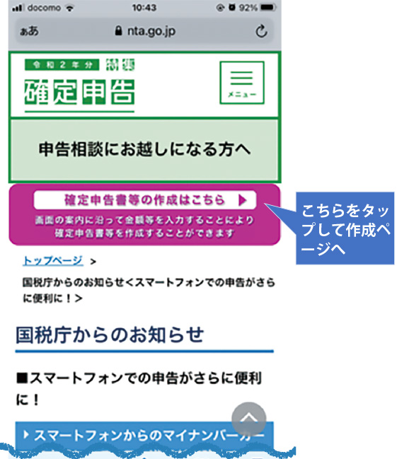 スマートフォン(=スマホ)申告の対象は、「医療費控除」「2カ所以上からの収入がある場合」など、会社員が一般的に申告するものはほぼ網羅されています。マイナンバーカードを持っている場合には「e‒Tax(マイナンバーカード方式)」を選ぶと、直接マイナンバーカードを読み取ったうえで、スマホから確定申告書の提出ができ手間が省けます。ただし、この方式には「マイナポータルアプリ」のダウンロードと、アプリに対応しているスマホが必要です。今回は、「医療費控除」を例に、スマホで作成できるe‒Taxのスマホ申告画面の一部を紹介します。