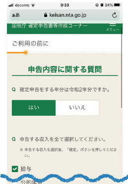 - 遷移後の画面で最初に、申告内容に関する質問への回答や利用規約への同意などを行います。