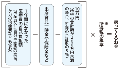 医療費控除は、1年間にかかった医療費が一定額を超えたとき、確定申告をすることにより、病院で支払った額の一部が還付される制度です。例えば、妊娠と診断されてからの定期検診や検査などの費用のうち、自己負担分や通院費用などが医療費控除の対象になります。