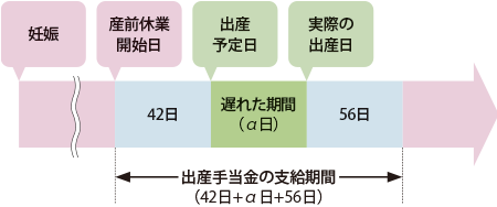 出産手当金は、健康保険から産休期間に対して支給されます。原則、出産日以前42日(多胎児の場合98日)から、出産日の翌日以降56日までの範囲が給付対象です。出産日が予定より早まれば手当金は少なくなり、出産日が予定より遅れた場合は、遅れた期間についても支給対象になります【図表4】脚注4。
