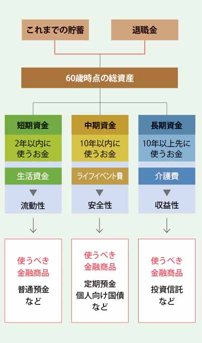 当面の生活資金は「短期資金」に当たり、就労収入や公的年金で賄います。