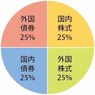 「増やす重視」のポートフォリオは、国内株式・外国株式・国内債券・外国債券の4資産を25%ずつ組み入れています。株式が全体の50%を占めるため、運用次第では相応のリターンを狙える一方で、運用リスクもあります。