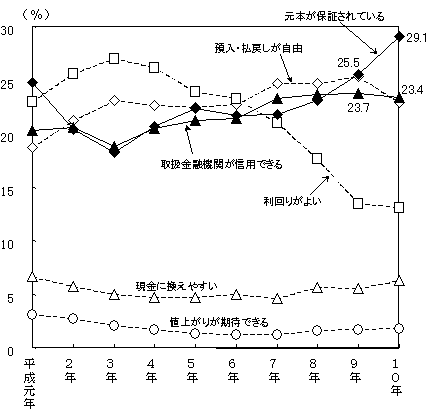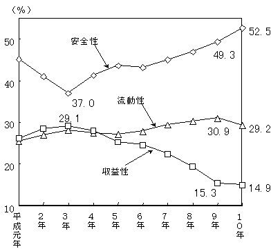 貯蓄商品を選択する際に最も重点をおくことについて、「安全性」、「流動性」、「収益性」の3基準に分けてみると(注)、「流動性」、「収益性」がともに小幅減少となった一方、「安全性」は平成7年以降4年連続で増加している。この間、「安全性」に関わる項目について個別にみると、「取扱金融機関が信用できるから」との回答はほぼ横這いである一方、「(その商品の)元本が保証されているから」が著増する格好となっている。
