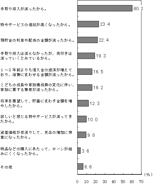 消費支出を減らした理由としては、「手取り収入が減ったから」との回答が約6割と最も多く、「手取り収入は先行き減っていくとみているから」、「将来を展望して貯蓄にまわす金額を増やしたから」といった将来に対する不安や展望に基づくものも全体の3割弱となっている。